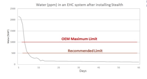 Hydrolysis is the main degradation pathway in phosphate ester systems. Because phosphate esters are hydroscopic, moisture control is a critical step in phosphate ester maintenance. Stealth EHCTM uses patented technology that removes moisture from phosphate ester fluids by introducing a steady stream of clean, dry air in the reservoir. This enhances reservoir breathing systems by actively and continuously purging and dehydrating the reservoir head space and removing water from the fluid.